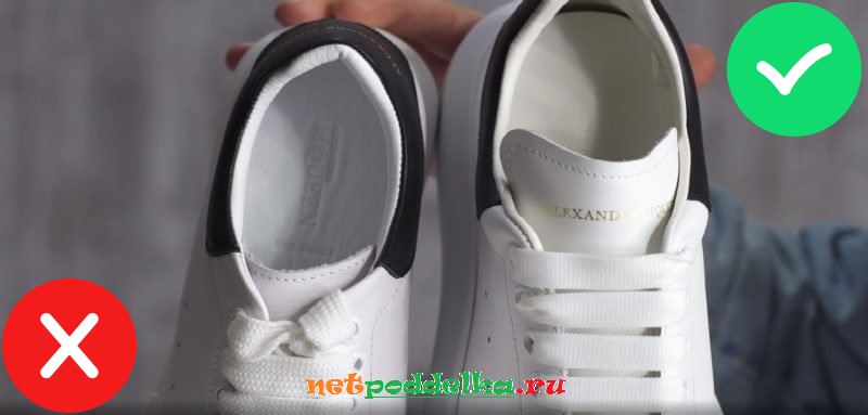 Шов на боковой кожаной части у оригинала кроссовок Александр Маккуин имеет острый угол. Что касается фейковых кроссовок, то эти швы немного закруглены.